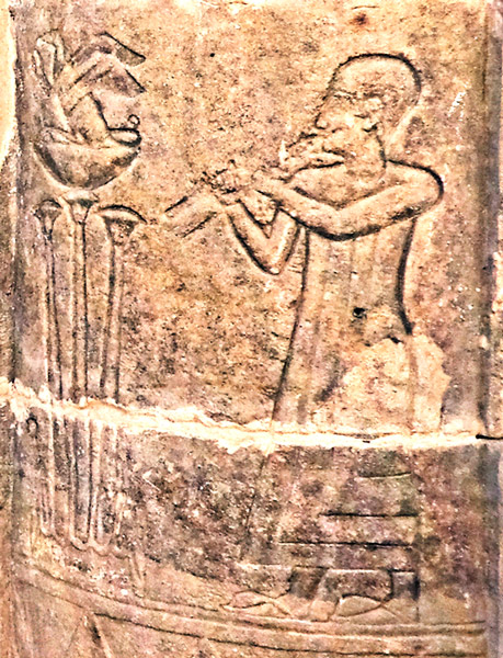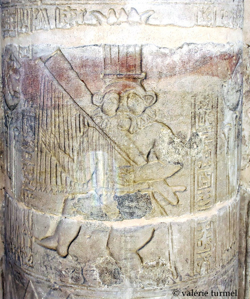 Le dieu Bès joue d'une harpe rudimentaire tout en tenant sa massue de la main gauche. Bès est étroitement associé à Hathor, notamment en tant que dieu de la musique et de la danse; Bès fait partie du cortége qui accompagne Hathor lors de son retour. Des restes de couleur subsistent sur la colonne.