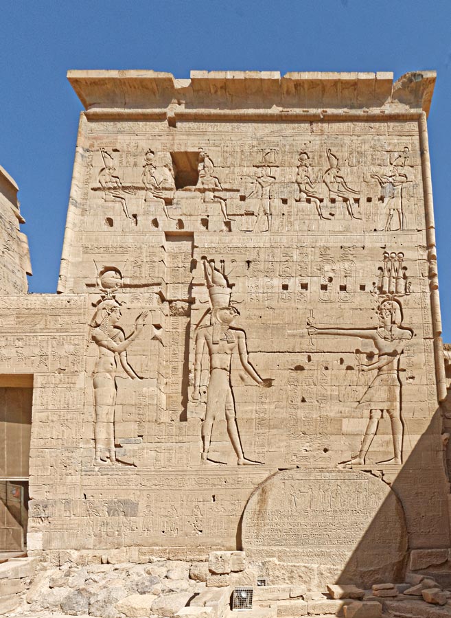 A droite, le roi Ptolémée VI suivi de la reine offre les champs à Osiris et Isis. Derrière le couple royal, Harpocrate.