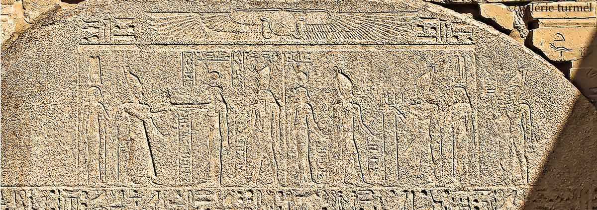 Symétriquement, à gauche, Hathor accompagné d'Horus tend un objet au couple royal. Au dessus, Behedet les protégé.