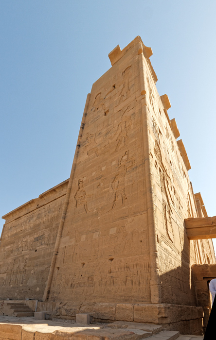 A droite, l'arrière du mammisi et le môle ouest. A gauche, l'extérieur du temple d'Isis. La face Ouest du 2nd pylône comprend 4 scènes: