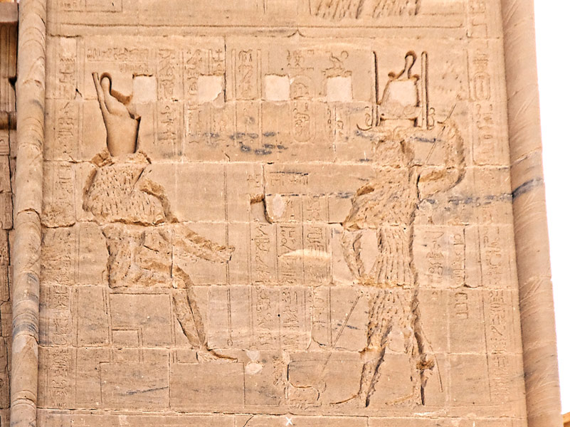 - en haut, le roi offre une barque à Horus d'Edfou. -second registre : le roi offre les 4 veaux à Osiris assis. Pour les 2 scènes suivantes, voir ci-dessous. A la base, le roi suivi de porteurs d'offrandes devant Osiris et Isis.