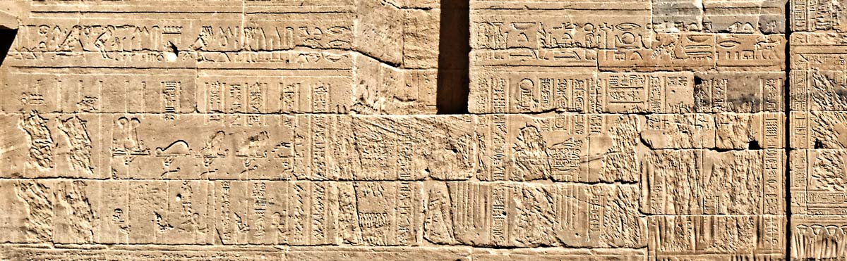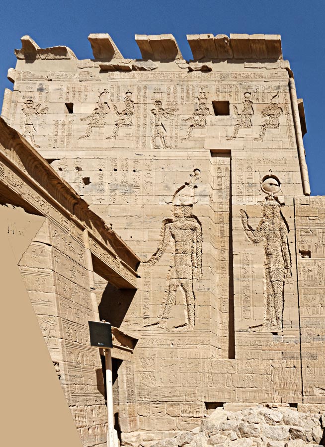 - à gauche, le roi Ptolémée XII Neos Dionysos fait une offrande à Horus et Isis.