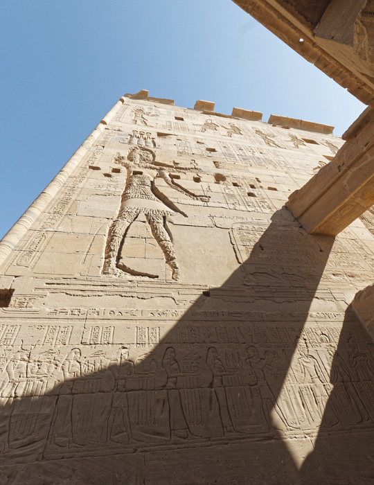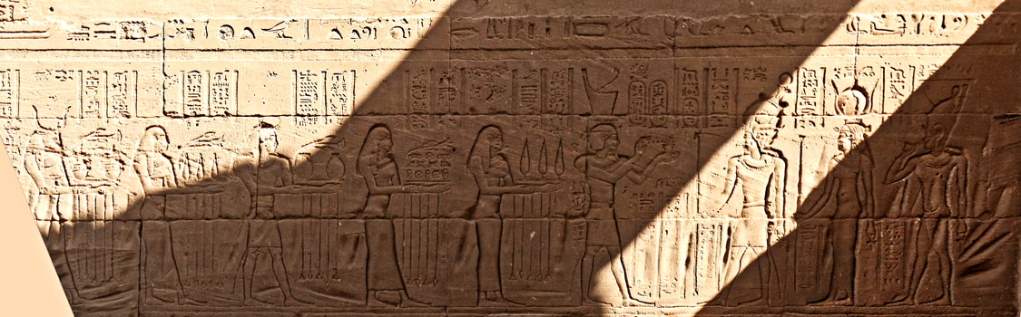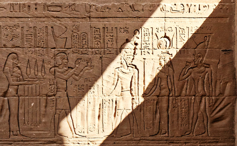 Il apporte des présents à Osiris, Isis et Horus. A gauche, les baou de Nekhen.