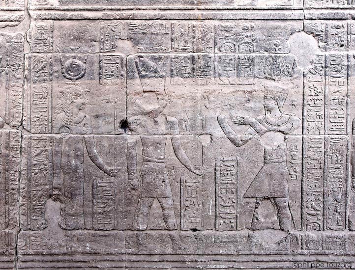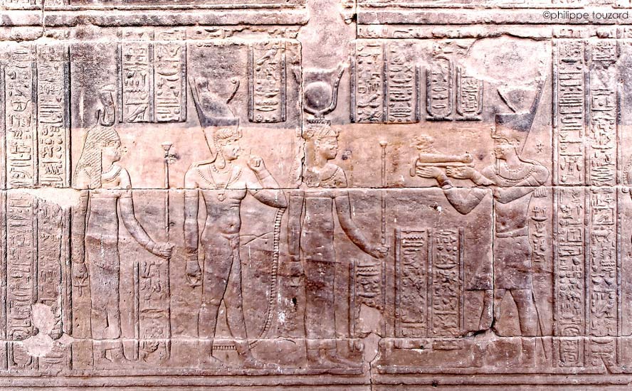 L'empereur Tibère offre de l'huile à Horus et Nephtys