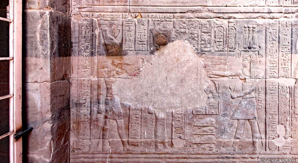 L'empereur Tibère offre le collier menat à Hathor, Harsiesis et Wepset (?)