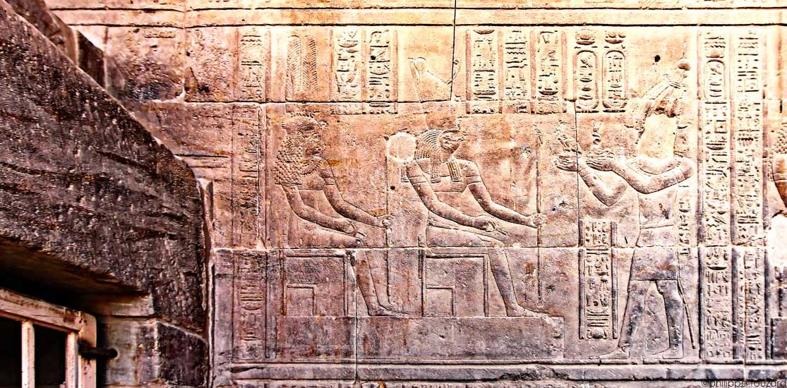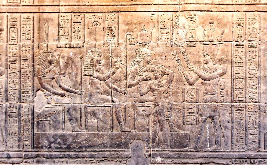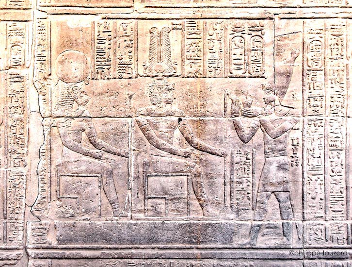 L'empereur Tibère offre un vautour et un uræus au dieu Horus accompagné d'Hathor.