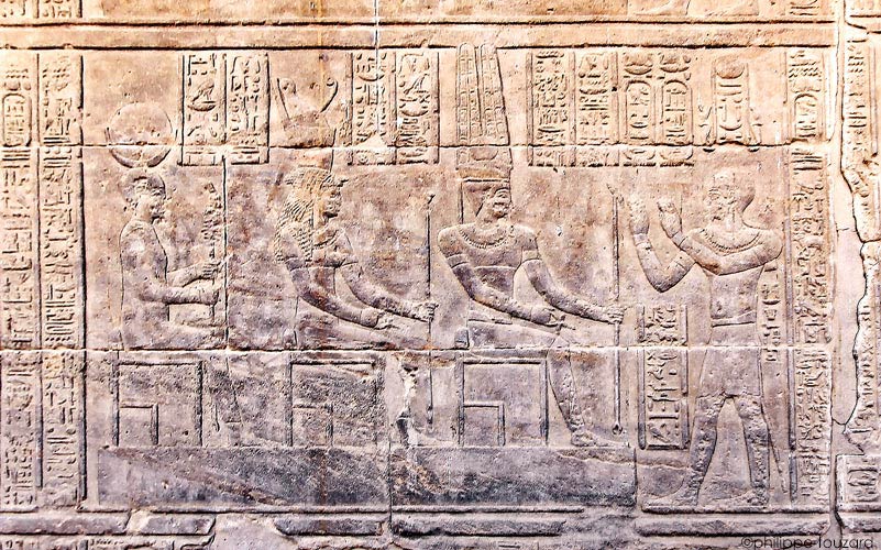 L'empereur Tibère offre un bouquet à Isiis qui allaite Horus. Derrière Isis, Sefekhet-âbouy, autre forme de Sechat, écrit sur un bâton recourbé marquant le temps et portant l'emblème de la fête-Sed. Enfin la déesse Maât est assise elle aussi sur un trône.