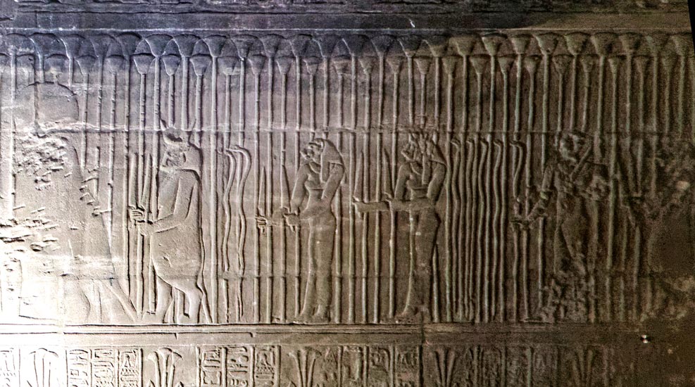 Paroi est : entre les scènes de la théogamie et les dieux Nil tout en bas, une série de génies protecteurs sont représentés. Contrairement aux autres scènes tournées vers le sanctuaire, ils sont tournés vers la porte pour la protéger et la défendre avec leurs armes : lances, couteaux. Deux représentations énigmatiques se trouvent au milieu. (voir ci-dessous).