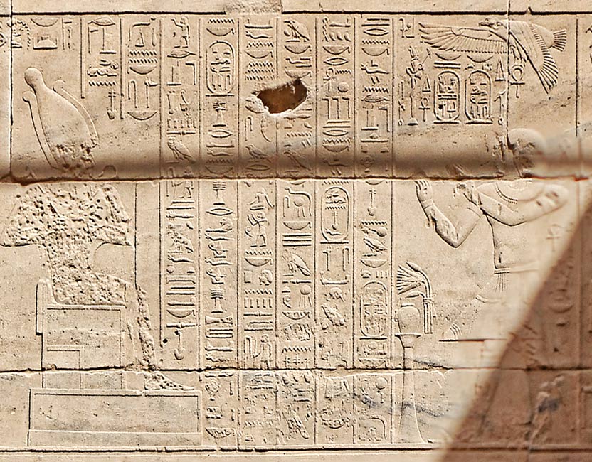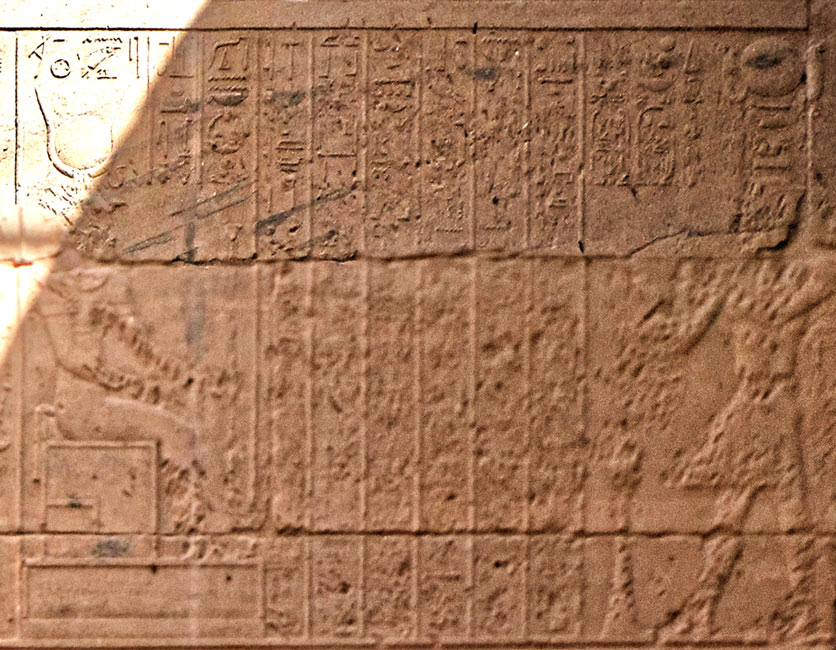 Le roi est aplati devant la déesse Isis. La scène est très martelée, mais les silhouettes sont reconnaissables.