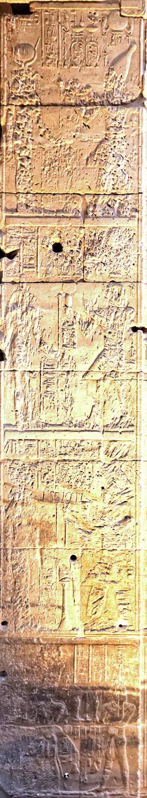 Behedet veille dans les scènes. Le roi offre le collier Menat à Hathor. Le collier est présenté par une petite sphinge portant la coiffe d'Hathor.
