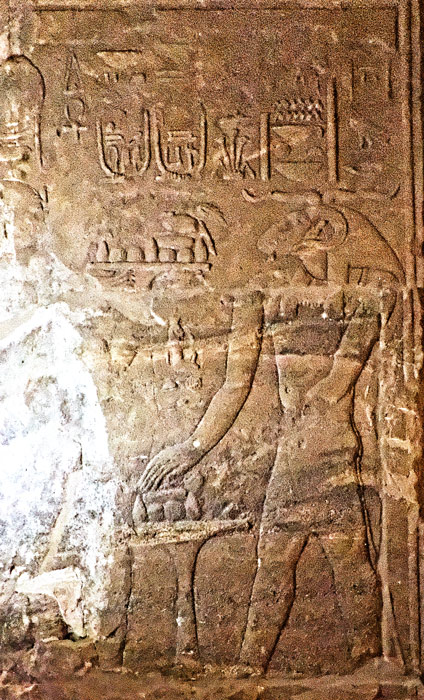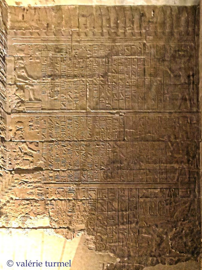 En haut, le roi tend la main vers un texte qui est une liste d'offrandes adressées à Isis.