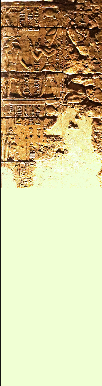 A gauche, en une colonne, les 7 vaches sacrées, le taureau "kakaouthahemout" et 7 cobras dressés.