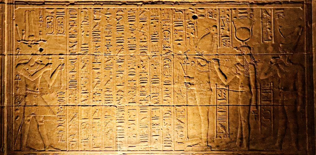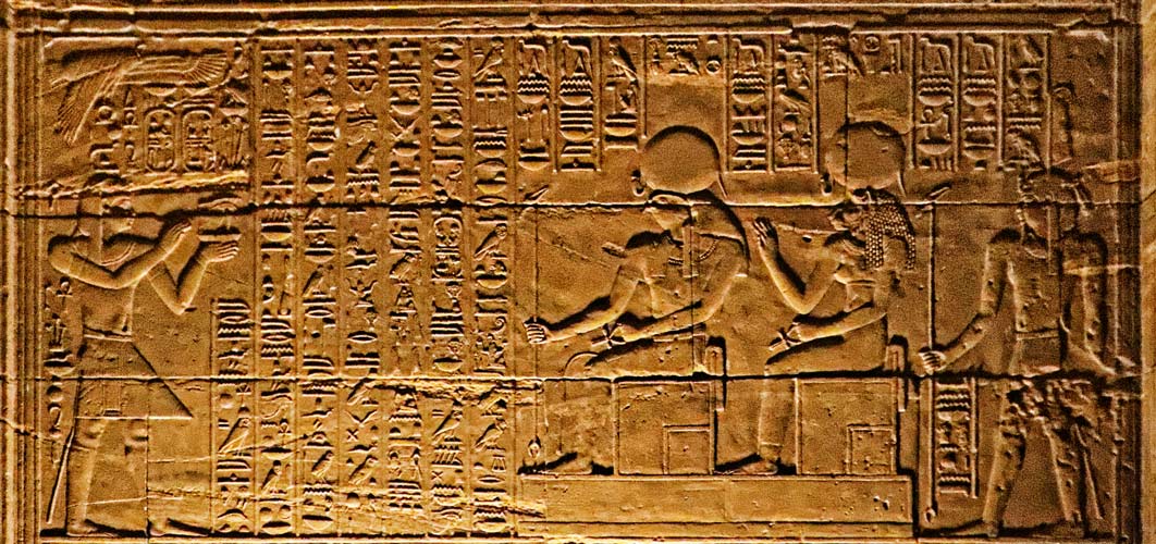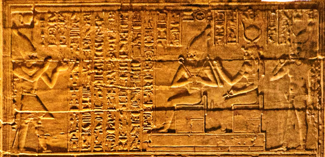 Le roi Ptolémée II fait l'offrande de la Maât et récite un hymne à Osiris, Isis et Harpocrate.