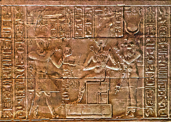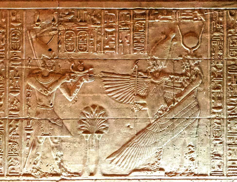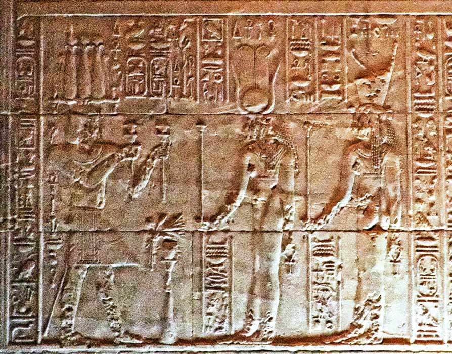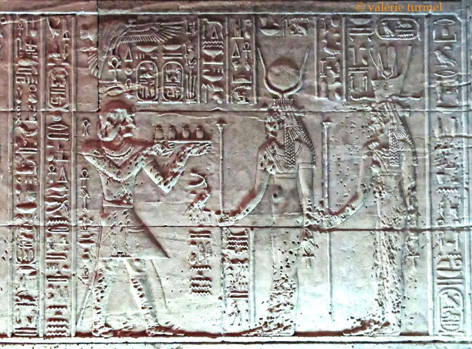 Le roi Ptolémée II joue du sistre pour Isis et Hathor.