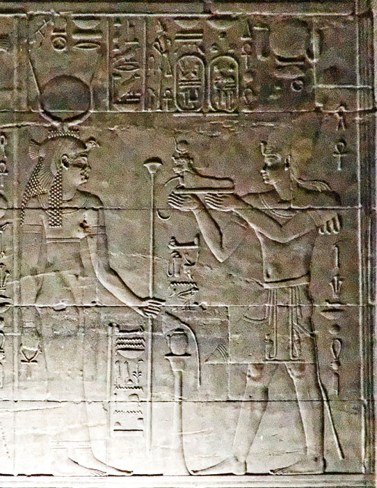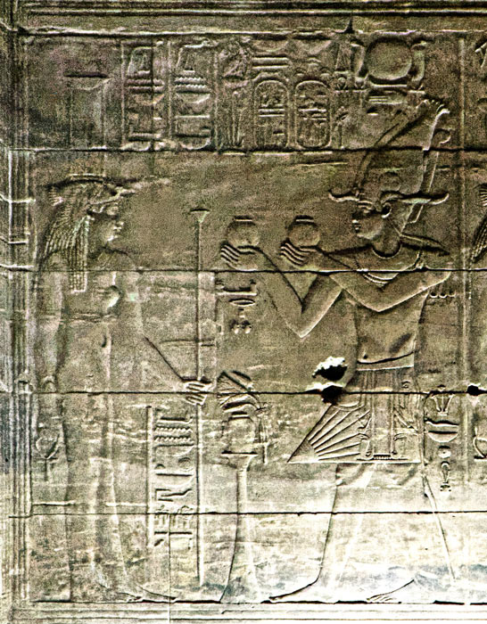 Le roi Ptolémée II encense Nekhbet. La déesse lui donne toute vie et pouvoir (ouas), ainsi que toutes les terres. en offrande.
