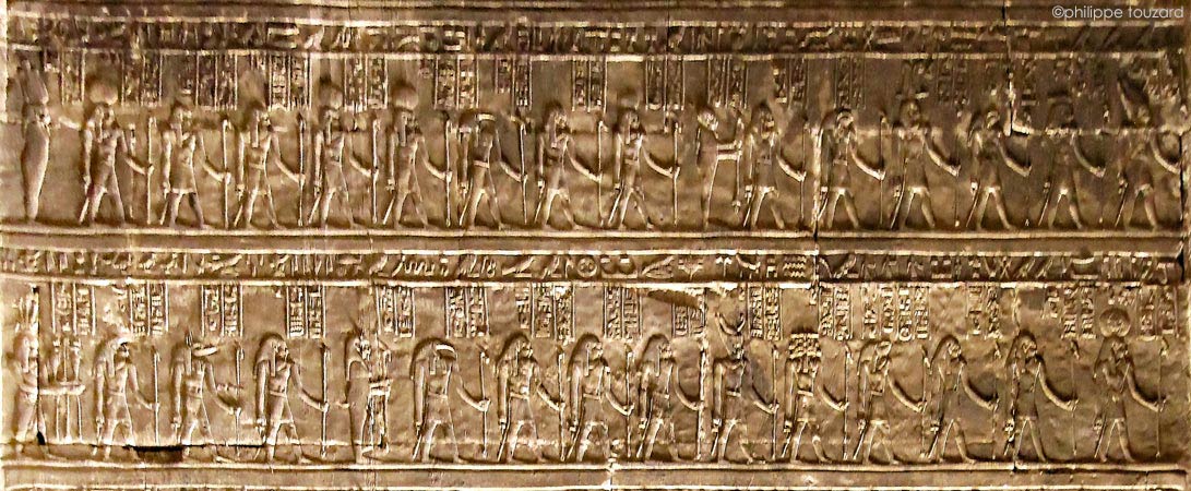Le roi Ptolémée IV offre de l'encens à huit dieux avec en tête Osiris le Bien Aimé , grand dieu qui est sur son lit, maître des couronnes aux parures étincelantes. Il est suivi par Isis la Grande, qui réside à Oujeset-Hor. Viennent ensuite Osiris Neb-Ankh, qui réside à Edfou; Isis dans Edfou, qui veille sur son frère; Osiris-Sepa, vénérable, grand dieu; Nephtys, lanceuse de flammes qui réside à Edfou: Osiris-Sokar,