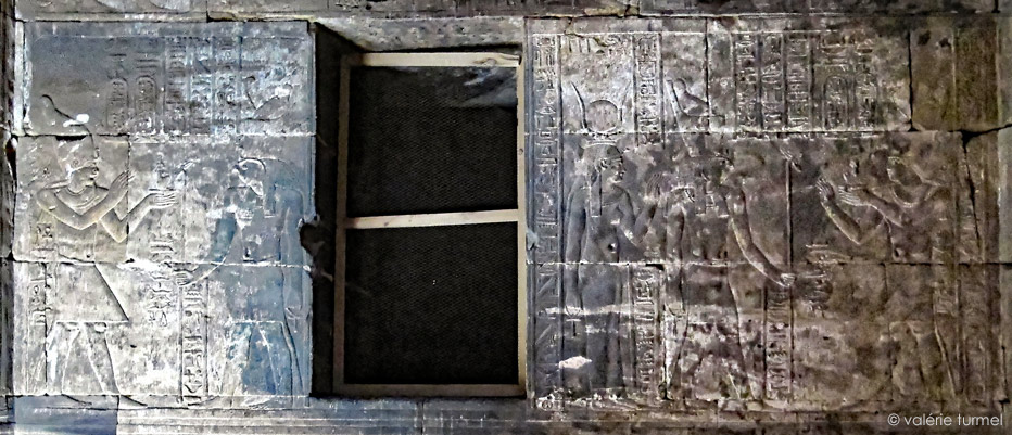Le roi Ptolémée IV pr"sente 4 fois les signes de vie et de pouvoir à Sokar-Osiris protégé par Merkhetes, double de Nephtys, protectrice d'Osiris.