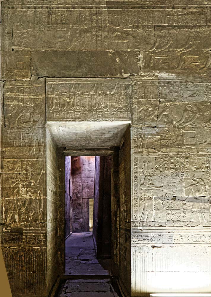 Le linteau montre les cartouches du roi Ptolémée IV Philopator. par la porte, s'entrevoit le couloir mystérieux et en face, la chapelle du Trône de Rê.