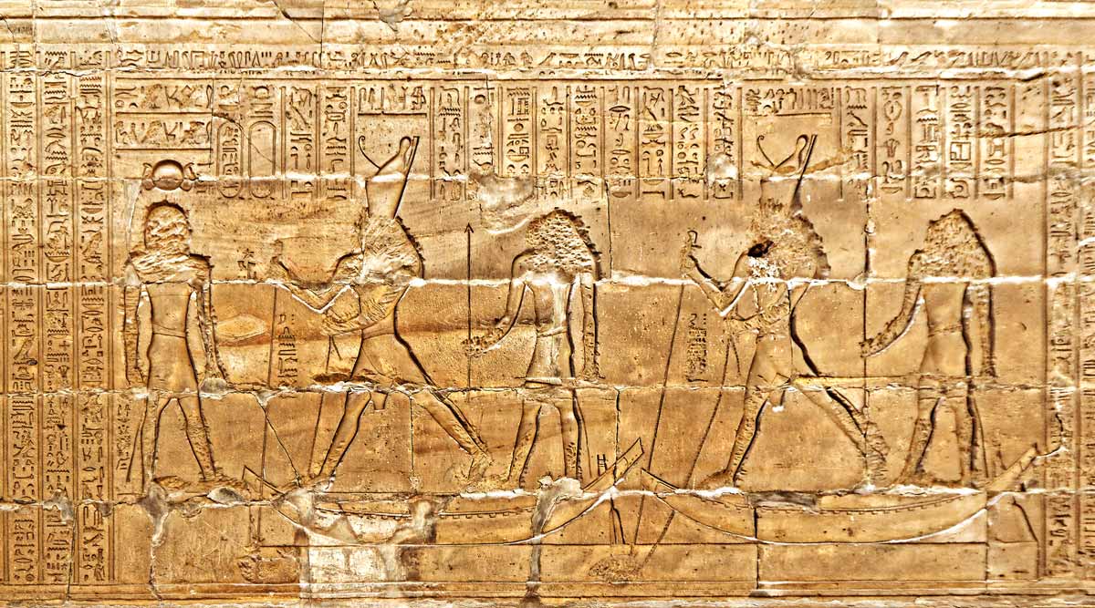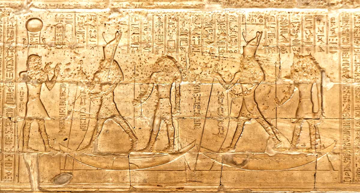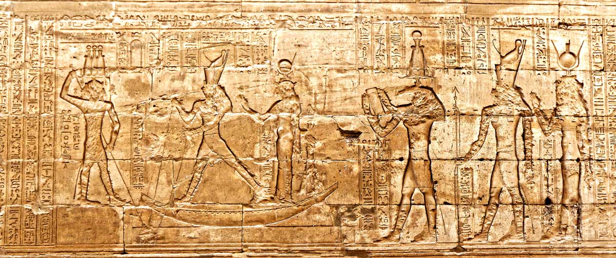 A l'avant de sa barque, Horus se prépare à son combat contre Seth représenté par un hippopotame dans les marais. Derrière lui sur la barque, Isis et Harsomtous. Il est aidé par le roi Ptolémée X qui veut aussi transpercer l(hippopotame. En dehors de la barque, Thot consigne la scène suivi par Horus, maître de Mesen et Isis.