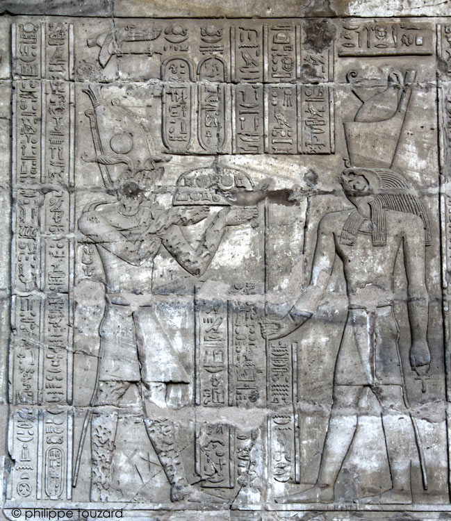 Le roi fait l'offrande de l'oeil Oudjat à Horus de Behedet.