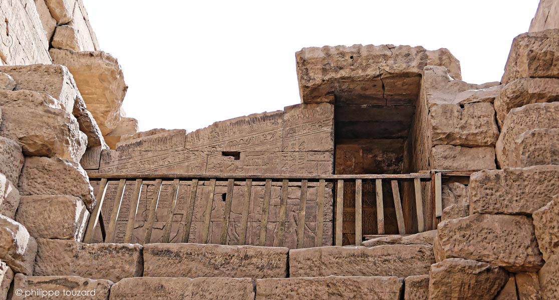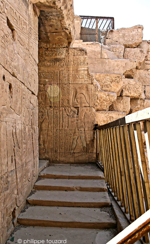 Derrière elle, un dieu Nil du Sud avec une aiguiére et des fleurs. On aperçoit une partie de la structure de la porte moderne qui ferme l'escalier juste avant cette partie.