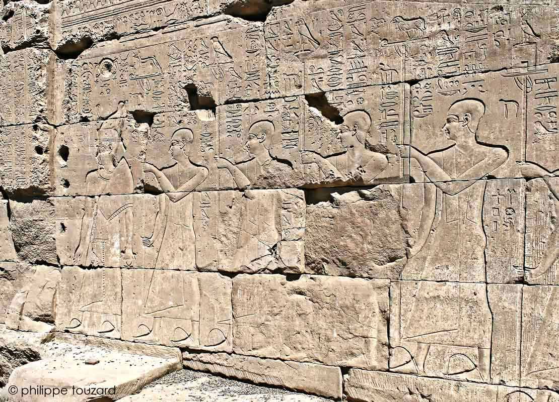 La procession du naos d'Horus est conduite par le roi Ptolémée VI Philometor. Il est suivi de prêtres portant des enseignes : à l'avant, Oupouaout du Sud, l'ouvreur des chemins; puis Horus de Behedet ; une autre forme d'Horus; le bélier d'Amon; Chou, fils de Rê...