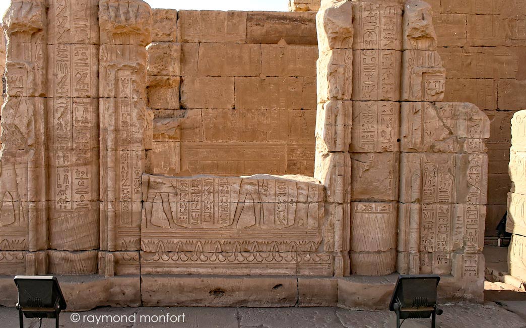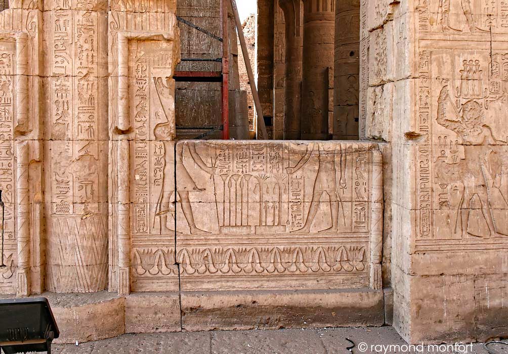 Le roi offre un collier large héliopolitain à Horus de behedet accompagné d'Hathor.