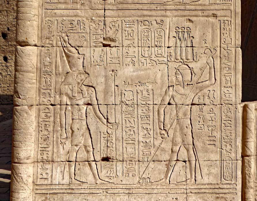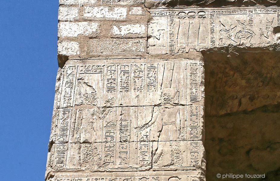 Le dieu Amon-Rê et la déesse Nekhbet. En haut, les inscriptions de l'architrave.