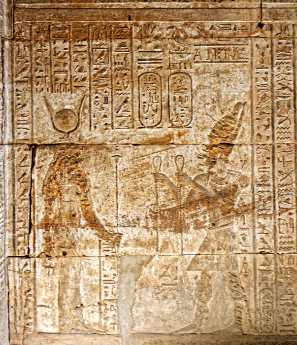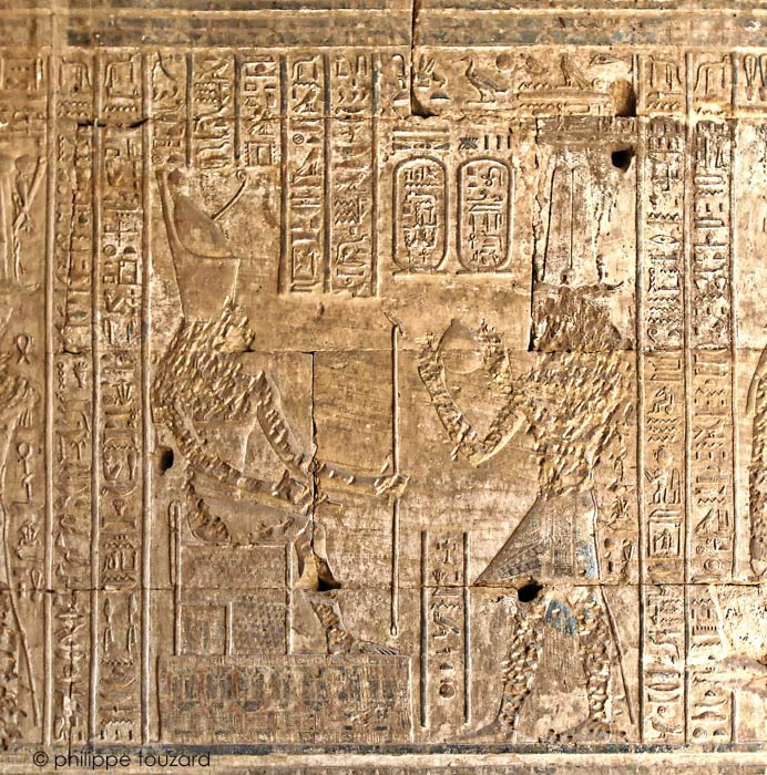 Le roi Ptolémée IV de l'onguent présenté par un petit sphinx à Harsomtous, fils d'Hathor