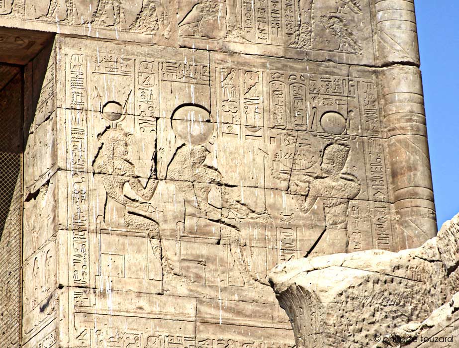 - en haut, le roi Ptolémée IX massacre un hippopotame, animal séthien, devant Horus et Isis.