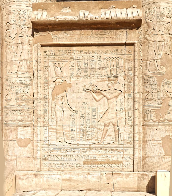 Sue le mur bahut, le roi Ptolémée VIII se tient devant Horus. Au dessus de lui, Behedet veille.