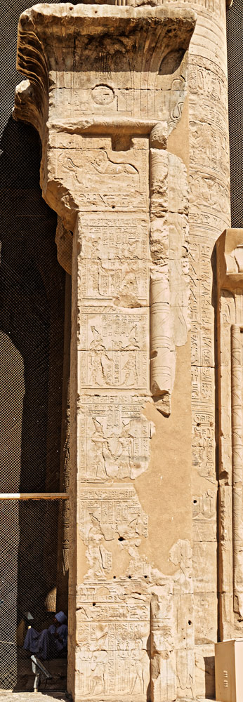 En dessous, sur la pseudo-architrave, le roi Ptolémée VIII Evergéte est représenté en sphinx devant Horus.