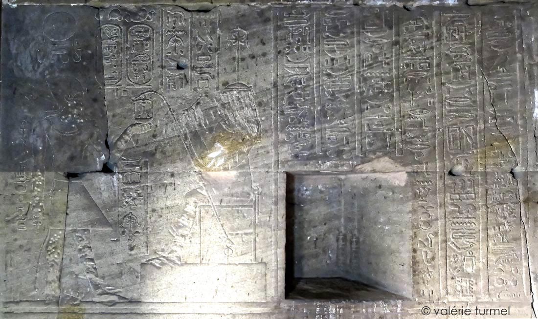 La niche dans le mur contenait un coffre dans lequel étaient rangés différents papyrus. Les 6 lignes de textes donnent une partie de la liste des papyrus : formules pour conjurer les forces du mal, recettes du laboratoire, un inventaire des offrandes et des dieux, un ouvrage d'astronomie, un manuel de décoration et des livres de liturgie. (S. Cauville, Edfou, p.18). La paroi d'en face comporte elle aussi une niche et 7 lignes de texte qui complètent celles-ci.