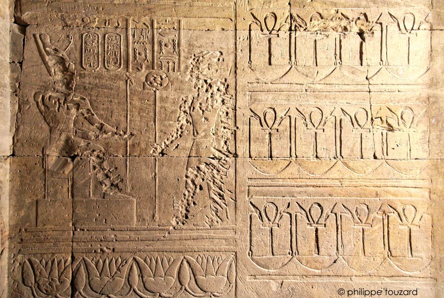 Horus purifie le roi avec de l'eau. Sylvie Cauville remarque qu'Horus n'est pas celui qui est honoré dans le temple, mais une forme subalterne qui joue le rôle d'officiant.