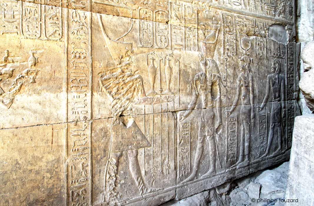 Le roi Ptolémée VIII Evergetes II accompgné par Cléopatre II (mains visible à gauche) coduit ledéfilé des dieux Nil porteyrs de présents vers Horus de behedet, le grand dieu,mître du ciel, suivi d'Hathor d'Iounet et d'Harsomtous, fils d'Horus et d'Hathor.
