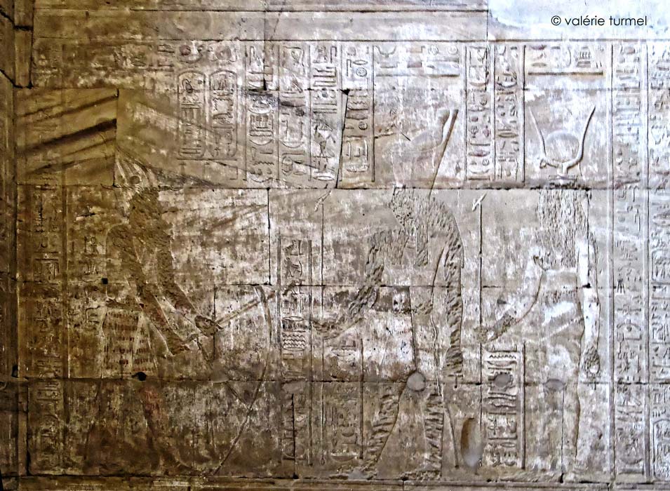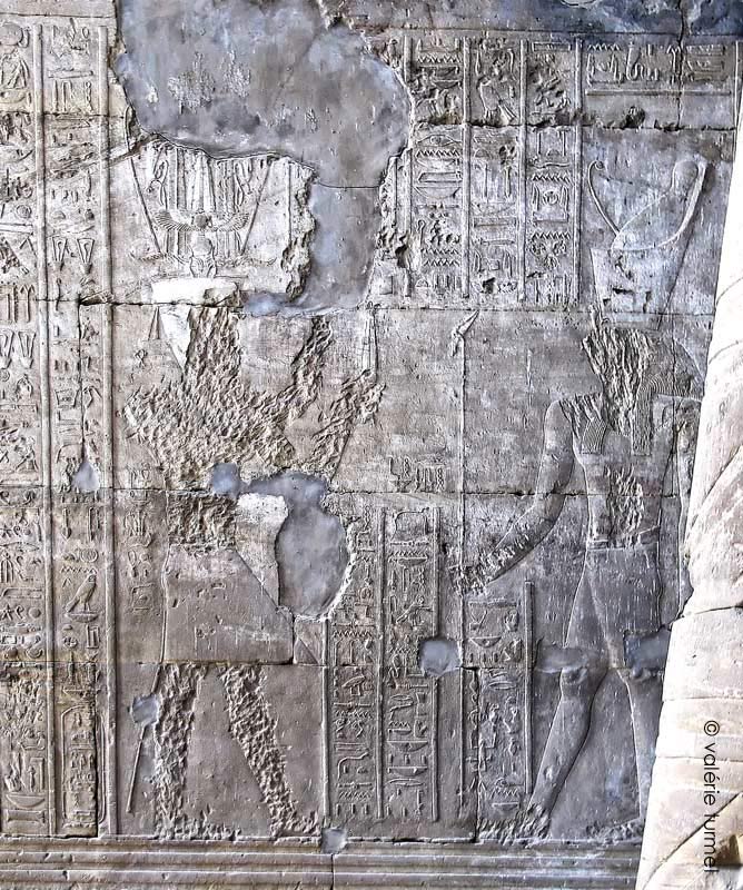 Le roi Ptolémée VIII lance du natron pour purifier le temple. Derrière le roi, la formule de protection.