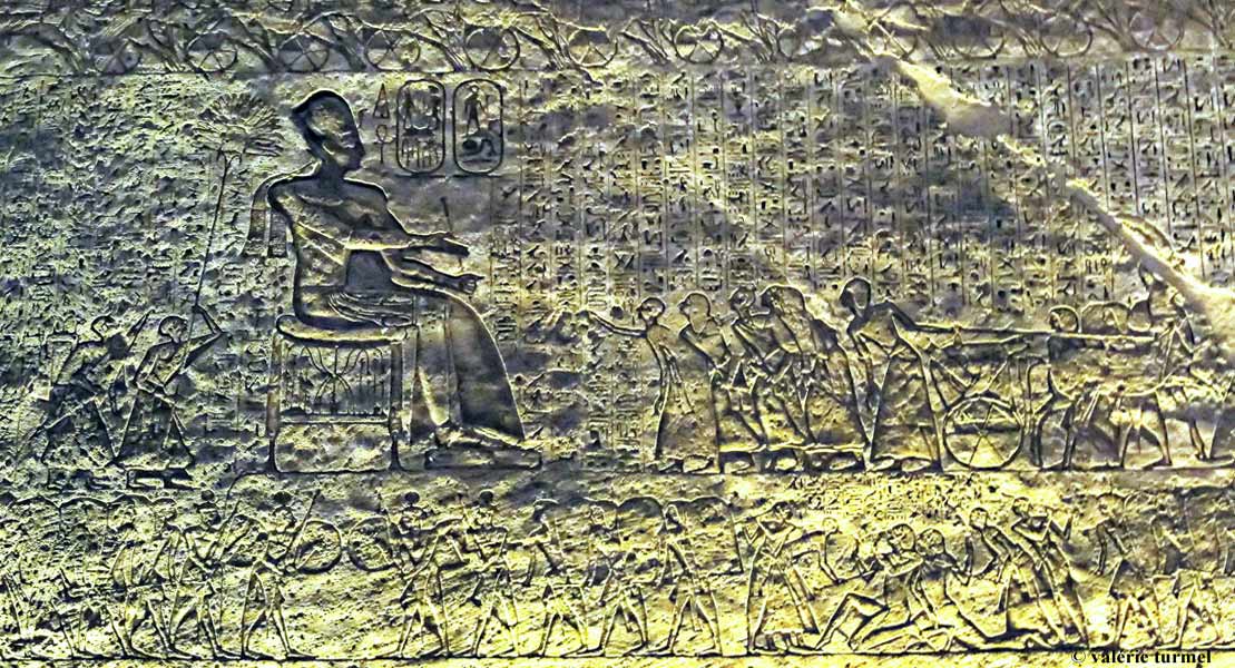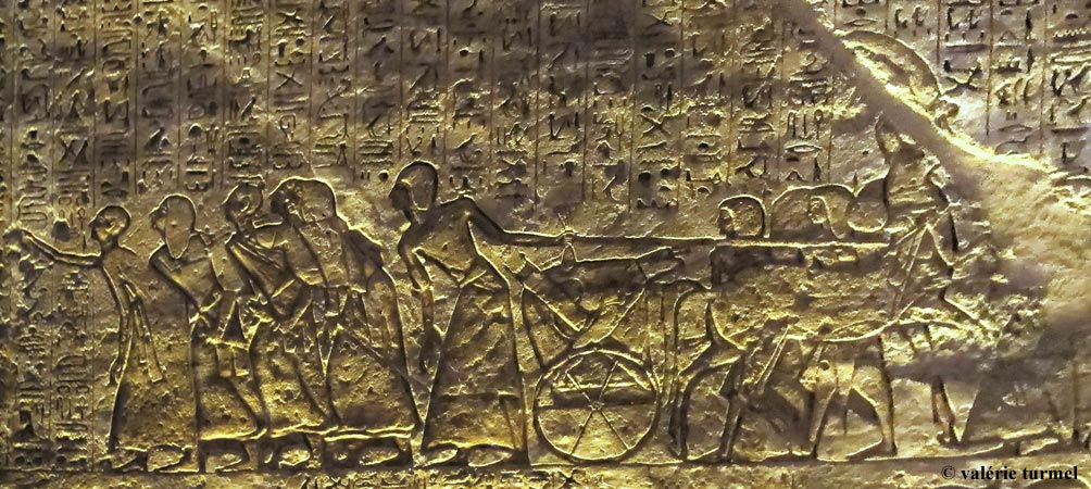 Sur son trône, est dessiné le Sema-Touy, lys et papyrus réunis qui évoquent les deux parties constitutives de l' Égypte. En face de lui, son fidèle écuyer Menenna lui a préparé son attelage