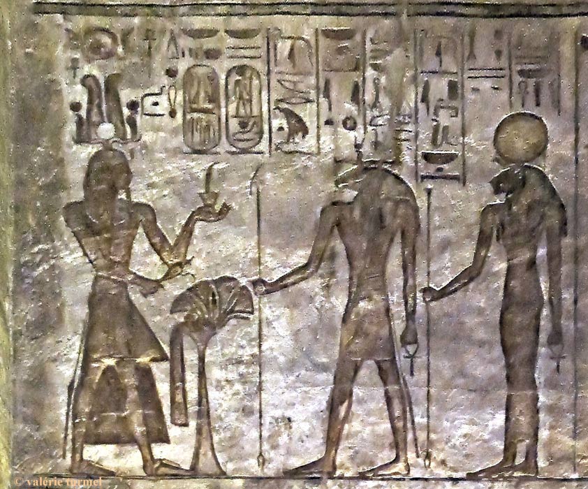 Ramsès II jette dans le brasier des grains de résine odorante pour le dieu Ptah. Devant lui,sur un guéridon sont posées des cassolettes d'encens et différentes offrandes. Le dieu porte un collier ousekh dont le contrepoids est visible dans son dos.