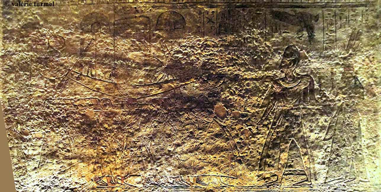 Porte latérale Nord : les noms des 5 divinités assises sont ici bien lisibles : Montou (n'est pas sur la vue), Atoum, Chou, Tefnout et Geb. La décoration est faite des cartouches du roi.