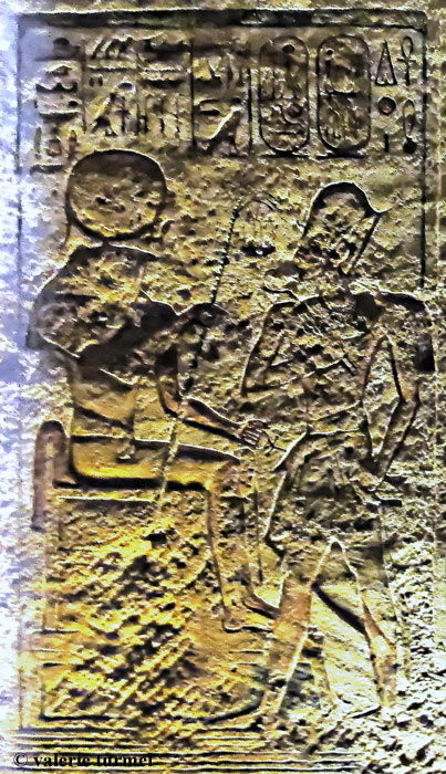 Scène de la paroi Ouest : Ramsès se tient debout devant Rê-Horakhty, un oiseau Rekhyt à la main.. Le dieu lui présente l'emblême des fêtes-sed et lui promet que tous les pays étrangers seront sous ses sandales.