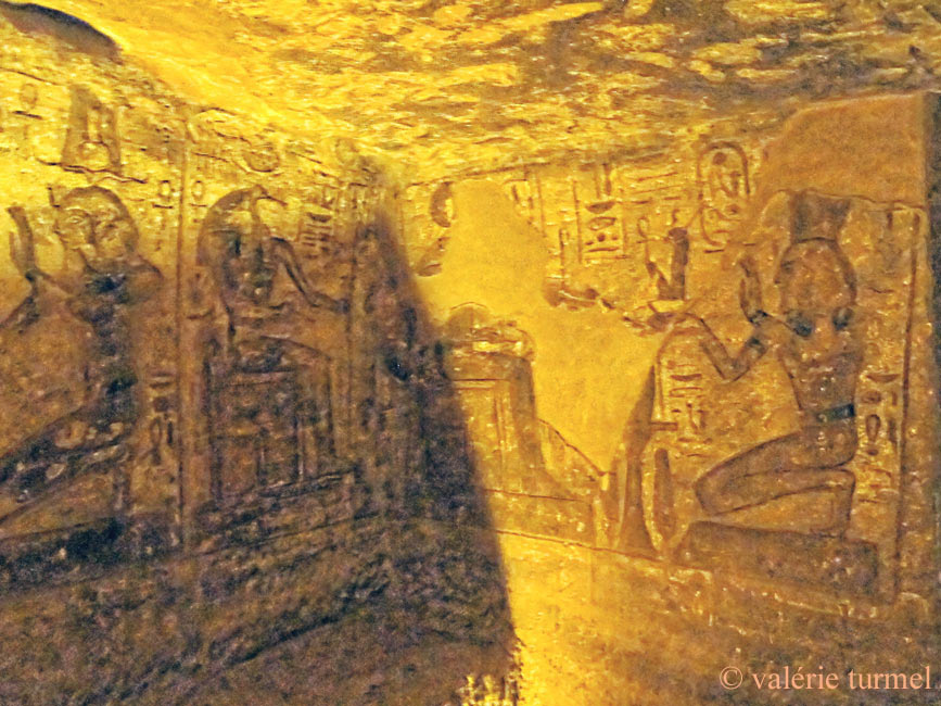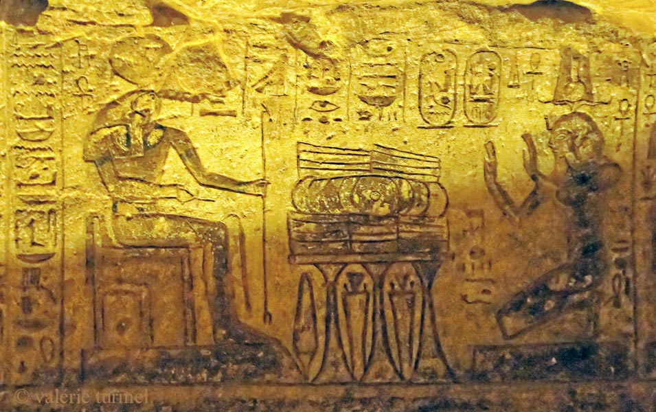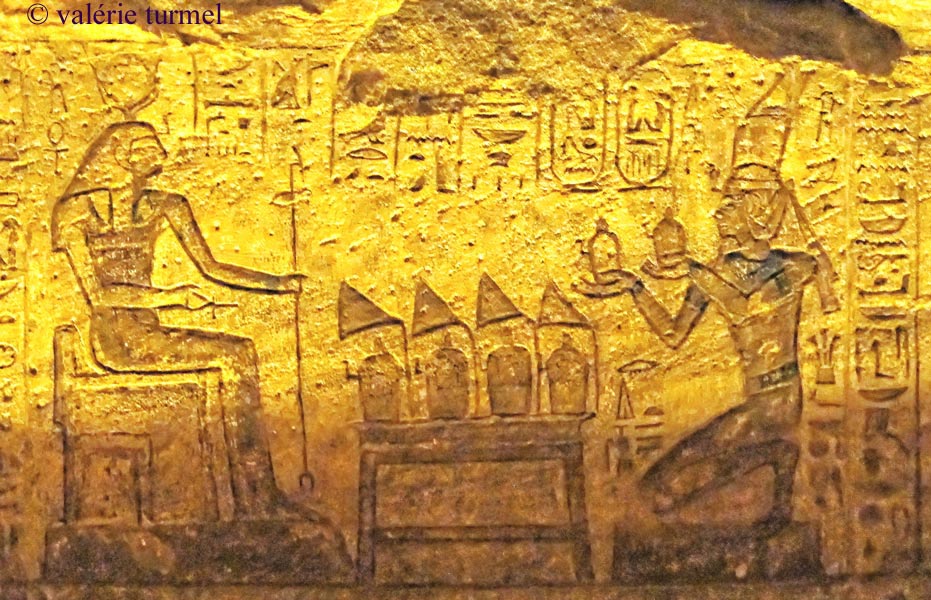 Ramsès II fait le signe d'adoration, adoration à faire 4 fois. En face du roi, le dieu Rê-Horakhty est assis.