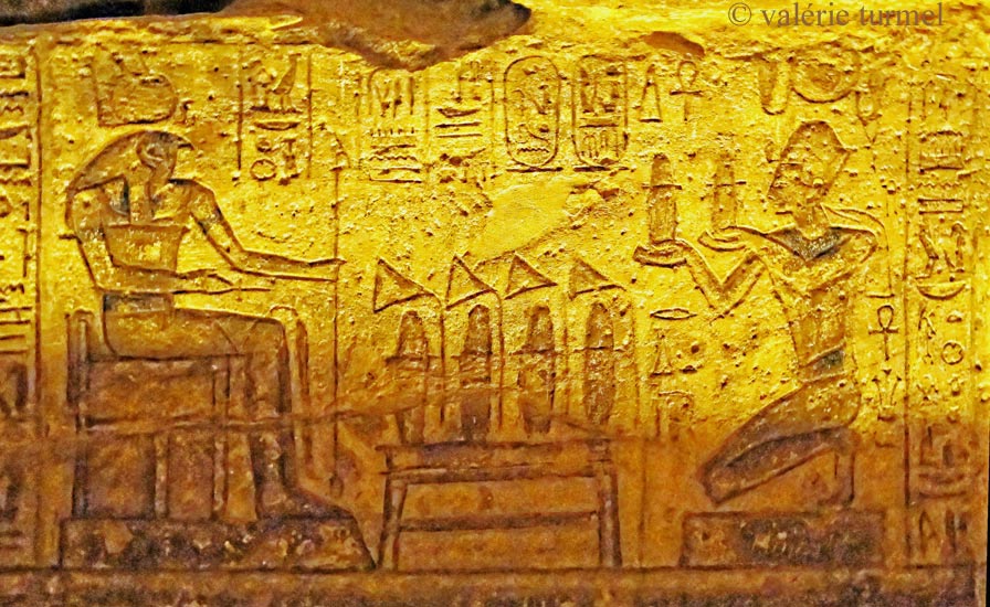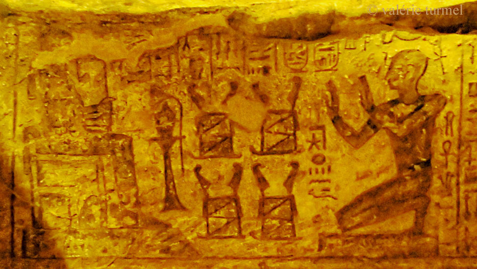 Le roi agenouillé adore 4 fois son père Ptah. Entre eux deux, les 4 coffres Meret.