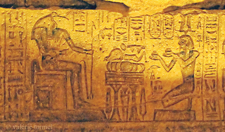 Ramsès II fait l'offrande des 2 vases de vin à Thot de Nubie. Des victuailles sont placées devant le dieu : côtelettes, pain, cuisse et tête de boeuf, coeur. Dessous la table, un bouquet et 2 laitues.