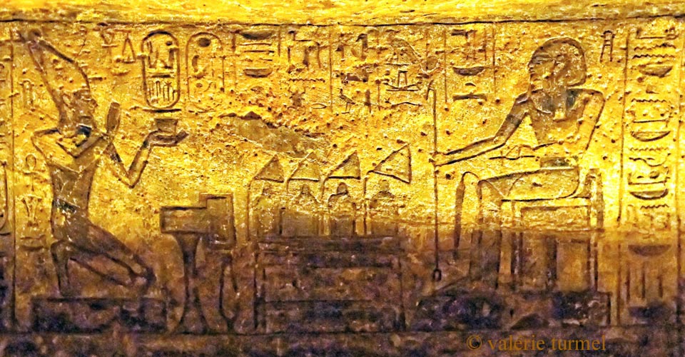Scène de gauche en entrant : la déesse Isis est représentée seule devant un guéridon avec des offrandes.
