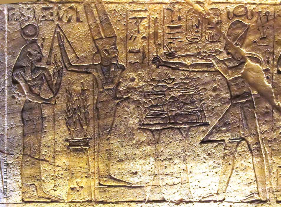 Ramsès II encense 2 divinités et bénit des victuailles avec le sceptre sekhem. Devant lui, le dieu Min-Amon est représenté ithyphallique sur un socle droit avec son jardin de salades derrière lui. Il est accompagné d'Isis, la mitresse du ciel, la souvearine des dieux.