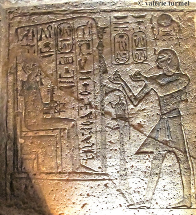 Scène à droite en entrant : Ramsès II offre 2 vases de vin à lui-même divinisé sous la forme de "Rê-messous-mery-Imen".. Le dieu est assis sur un trône et porte le disque solaire. Ici, contrairement aux autres scènes, le roi porte le Shendjit.