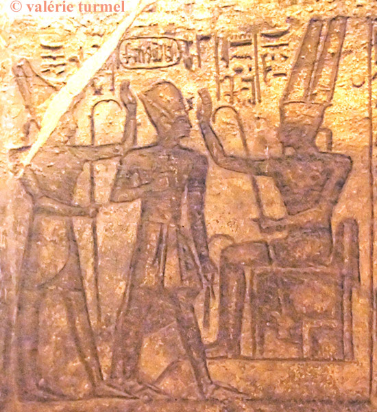 Le fond de la salle contient cette double scène d'introduction auprès des dieux. A gauche, Ramsès II est introduit par Atoum devant Amon qui donne au roi toute vie et toute puissance (colonne de hiéroglyphes non présente sur la vue).
