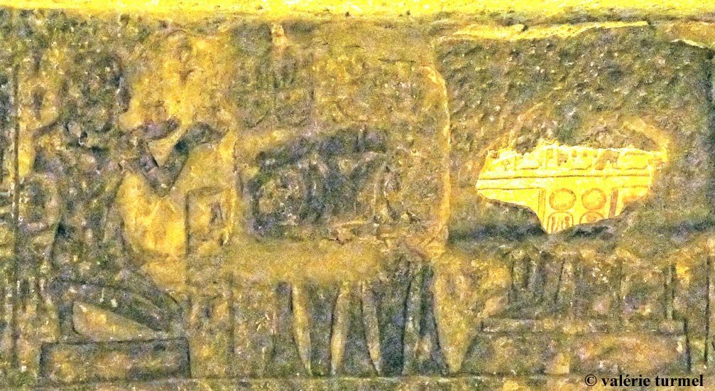Cette 1ère scène de la paroi Est est assez abimée, puisque l'on voit la salle O à travers d'une partie du mur. D'une façon générale, les scènes de cette salle sont assez dégradées. Dans cette salle, le roi est toujours représenté à genoux sur un support. Ici il offre 2 vases de vin à Thot dont on peut lire le nom sur les signes encore lisibles.