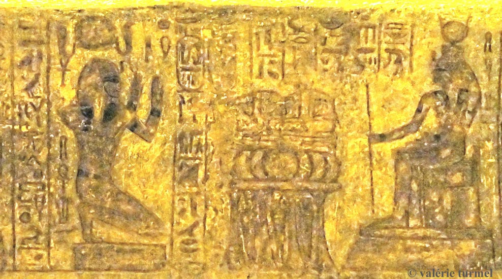 Ramsès II adore sa mère, la grande déesse Isis. Devant le roi, sur un guéridon , les offrandes.
