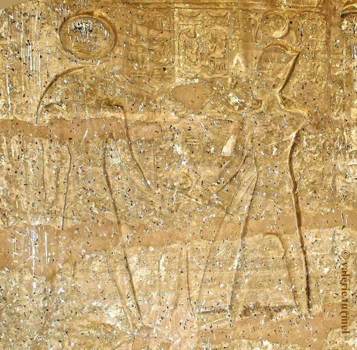 Paroi Sud, côté ouest, registre du haut : le roi fait l'offrande des 2 vases de vin à Ptah accompagné de lui-même divinisé. Les 2 divinités sont assises dans une chapelle.